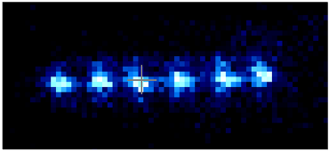 November 15, 2024 - The first ions are trapped in the Leibrandt group! After tuning things up, this image of six 88Sr+ ions was taken. These ions were trapped in the thorium experimental apparatus, where 88Sr+ is used for sympathetic cooling of 229Th3+.