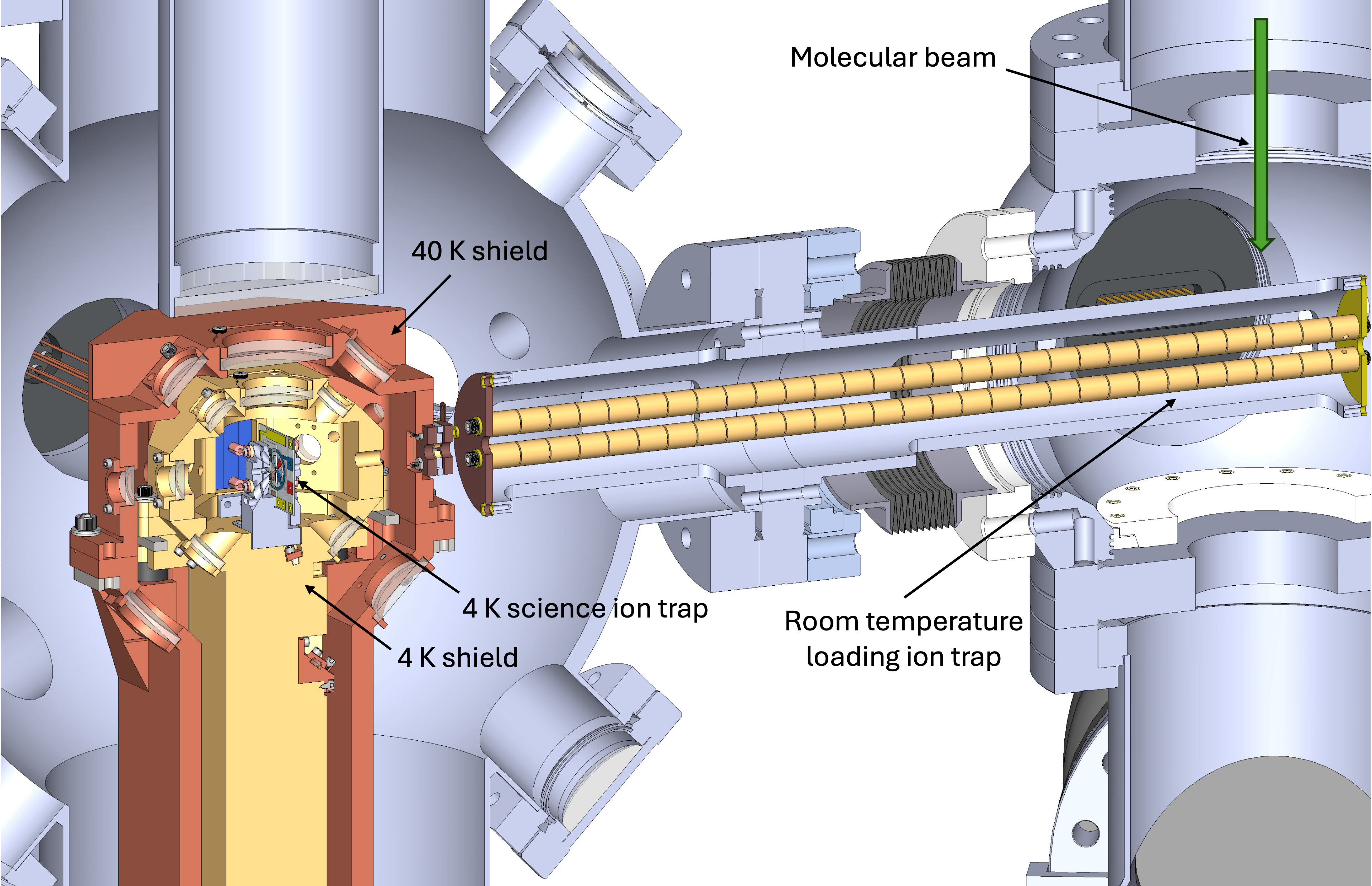 We will construct an apparatus based on the PI’s previous experiments with diatomic molecules at NIST [3-6], in which a single molecular ion is co-trapped with a single qubit ion. We will develop new techniques for loading molecular ions into the trap with internal temperatures well below 1 K. At these temperatures, tens to thousands of molecular quantum states will be populated, and we will use projective quantum-logic spectroscopy measurements to prepare the molecule in a single, pure quantum state as the starting point for our experiments [7].